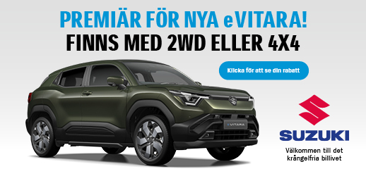 Suzukis första elbil, e-VITARA. 100% elektrisk med räckvidd upp till 426 km. Bilen är byggd för att klara alla vägar, väder och temperaturer, samt att du får med avancerad fyrhjulsdrift, robust batteriteknik och smarta lösningar till ett pris som gör den till ett av marknadens mest prisvärda elbilsköp.